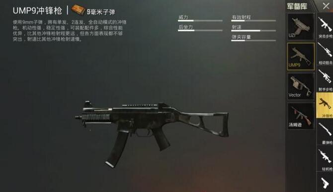 这把枪使用的是9mm子弹,伤害是35发/发,性能平均,没有什么缺点值得吐槽,冲锋枪中与步枪最相似也是上手难度最低的一把武器。可以使用3个配件。它的最大特点就是稳、贼稳,所以在比较稳定性上,毫无疑问UMP9更胜一筹。然而光稳定性而言是绝对不够的。