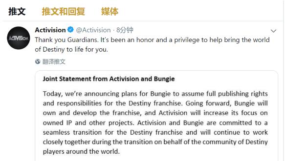 Bungie还在公告中表示,感谢动视多年以来提供的帮助,也感激广大玩家的支持,所有人都让Bungie学到了很多,从今天开始,Bungie将重新拥有独立身份,重回到单打独斗的拼搏状态,动视会继续运营自家IP,赌駏ngie则会把《命运》系列发扬光大。