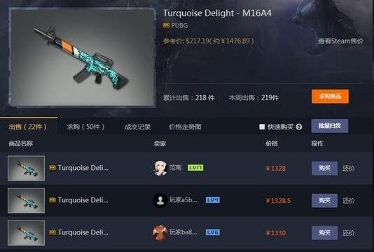 第三方平台上在售最贵的为碎魂98K,参考价格为1584rmb。但卖方的基本定价都在1800-1900rmb左右(堪比两把火麒麟)。紧随其后的是碎魂系列的M16A4皮肤。售价约在1300-1400rmb左右。这两款皮肤的开箱几率在0.012%,极低的开箱几率导致极其稀少,故而售价也是非常之高。也是非常之高。
