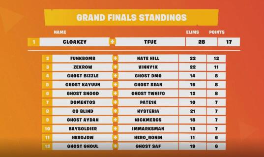 经过6周的激烈角逐以及预赛的选拔,比赛已是硝烟弥漫,在决赛中,Tfue不幸被对手抓住机会淘汰,不过Cloakzy发挥出色,最终成功帮助队伍拿下冠军。赛后采访Tfue坦言:是Cloakzy带领他取得胜利,并高兴的抱起Cloakzy环绕舞台,与在场观众一起为Cloakzy欢呼!