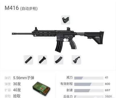 M416是常见的一把全自动步枪,也是采用5.56子弹,是绝地求生中最热门的步枪,号称枪中之王。M416在满配的情况下更是神器,射速快、后坐力小,配上红点或者是全息可以近距离战斗,配上四倍镜可以远距离单点,是一把全能步枪,广受大家喜爱,唯一的缺点就是配件太难凑齐。