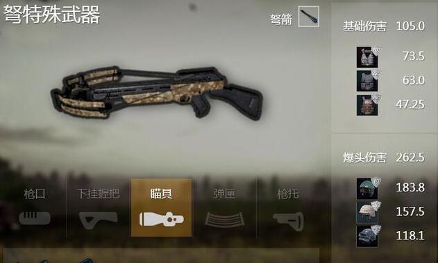 再来看它的爆头伤害,不管你是什么头的防具都是一击毙命。但这要非常高的技术,近点还好,稍微远点就要计算抬高了。 所以一箭射中头部逼死无疑。就算你被队友拉起来了,你的头部的那支箭还是存在你的身上,不可磨灭。